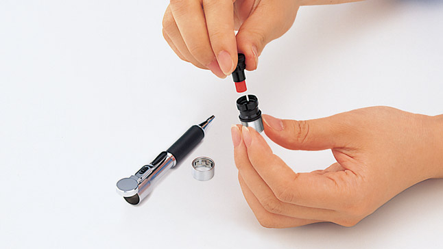 (1)本体から印面を外して、インキカートリッジを新しいものと差し替えてください。