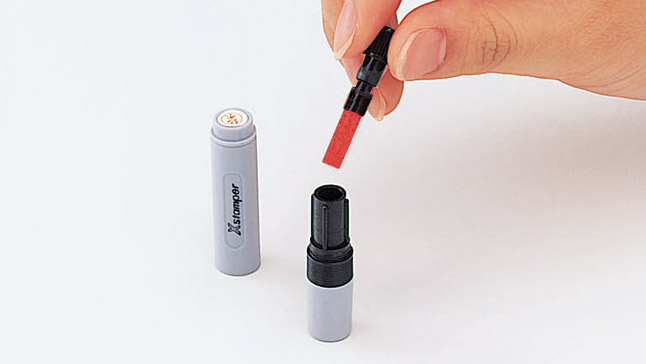 (1)ホルダーを外して、インキカートリッジを新しいものと差し替えてください。 ※インキ補充後初めてなつ印する際は、必ず試し捺しをしてください。 |