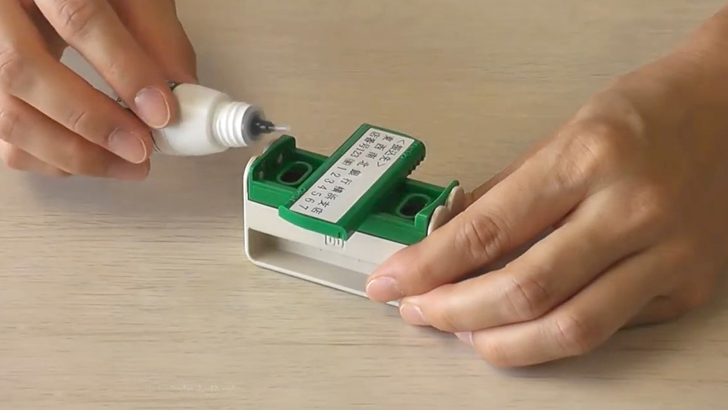 ![]() (1)見出し蓋を写真のようにインク注入口が完全に見える位置まで廻し開けます。 補充後、印影が回復するまで5〜6時間かかる場合があります。 ●インクが吸い込まれるのを確認しながらゆっくりと補充してください。 ●「インク補充口」を上にして製品を立てた状態で一晩程度放置してください。 インクは過剰に注入しないでください。 ●過剰補充しますと捺印の鮮明さが損なわれ、インク漏れの原因となります。 ●充分時間が経過しても回復しない場合は補充不足が考えられます。その場合は過補充に注意して再度インクを補充してください。 必ず専用インクをご利用ください。 ●他社・他種インクをご使用になりますと、インク成分の違いにより最悪の場合、捺印不能になる恐れがあります。 |