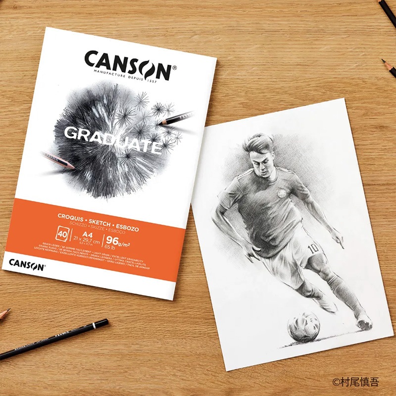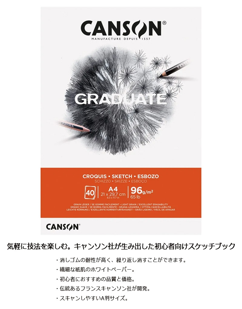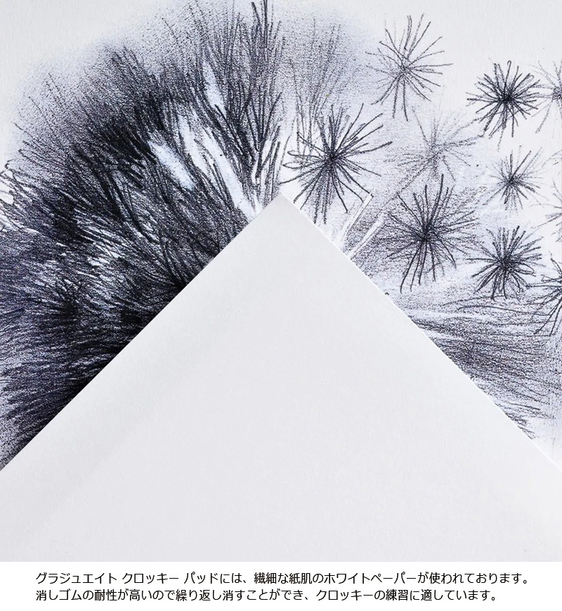 | 特徴 | 気軽に技法を楽しむ。キャンソン社が生み出した初心者向けスケッチブック ・消しゴムの耐性が高く、繰り返し消すことができます。 ・繊細な紙肌のホワイトペーパー。 ・初心者におすすめの品質と価格。 ・伝統あるフランスキャンソン社が開発。 ・スキャンしやすいA判サイズ。 グラジュエイト クロッキー パッドには、繊細な紙肌のホワイトペーパーが使われております。 消しゴムの耐性が高いので繰り返し消すことができ、クロッキーの練習に適しています。 |