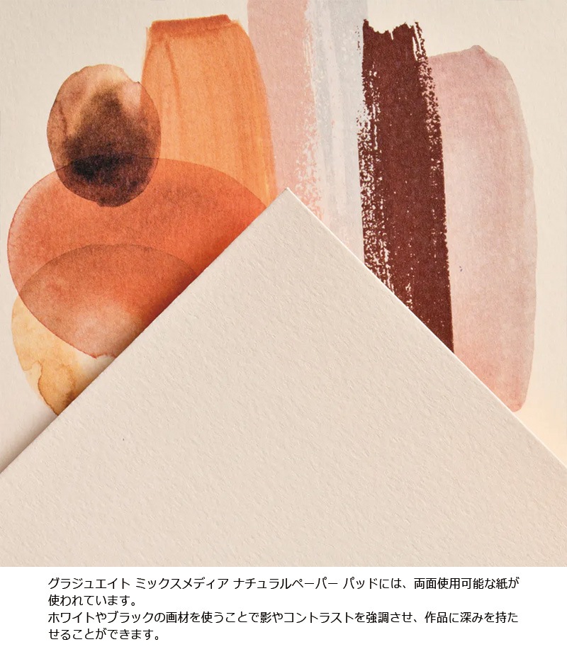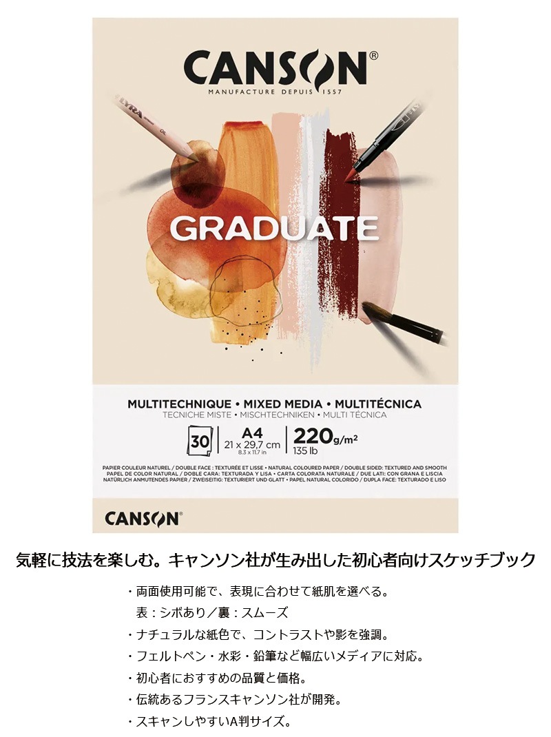 | 特徴 | 気軽に技法を楽しむ。キャンソン社が生み出した初心者向けスケッチブック ・両面使用可能で、表現に合わせて紙肌を選べる。 表:シボあり/裏:スムーズ ・ナチュラルな紙色で、コントラストや影を強調。 ・フェルトペン・水彩・鉛筆など幅広いメディアに対応。 ・初心者におすすめの品質と価格。 ・伝統あるフランスキャンソン社が開発。 ・スキャンしやすいA判サイズ。 グラジュエイト ミックスメディア ナチュラルペーパー パッドには、両面使用可能な紙が使われています。 ホワイトやブラックの画材を使うことで影やコントラストを強調させ、作品に深みを持たせることができます。 |
